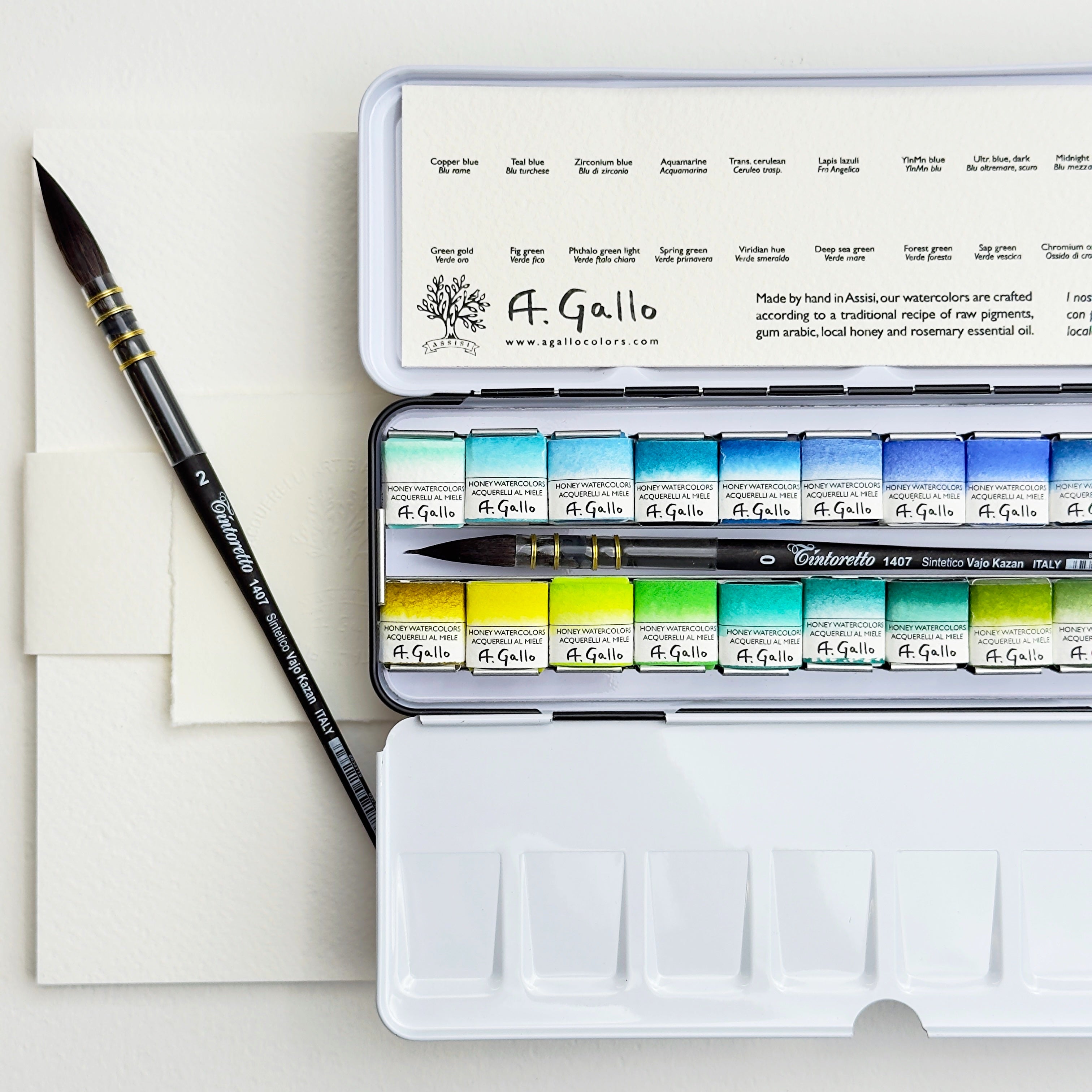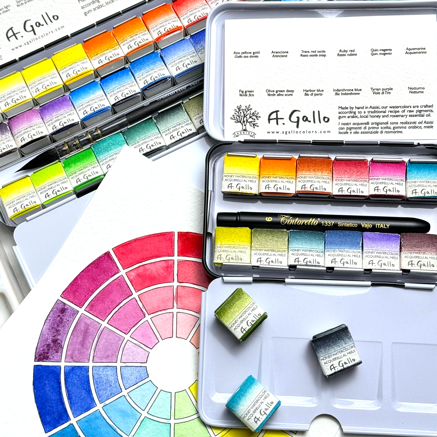 Handmade in Italy, A. Gallo watercolors are created from the best natural, historical and innovative modern pigments available today according to a traditional recipe of raw pigments, gum arabic, local honey from Umbria and rosemary essential oil.