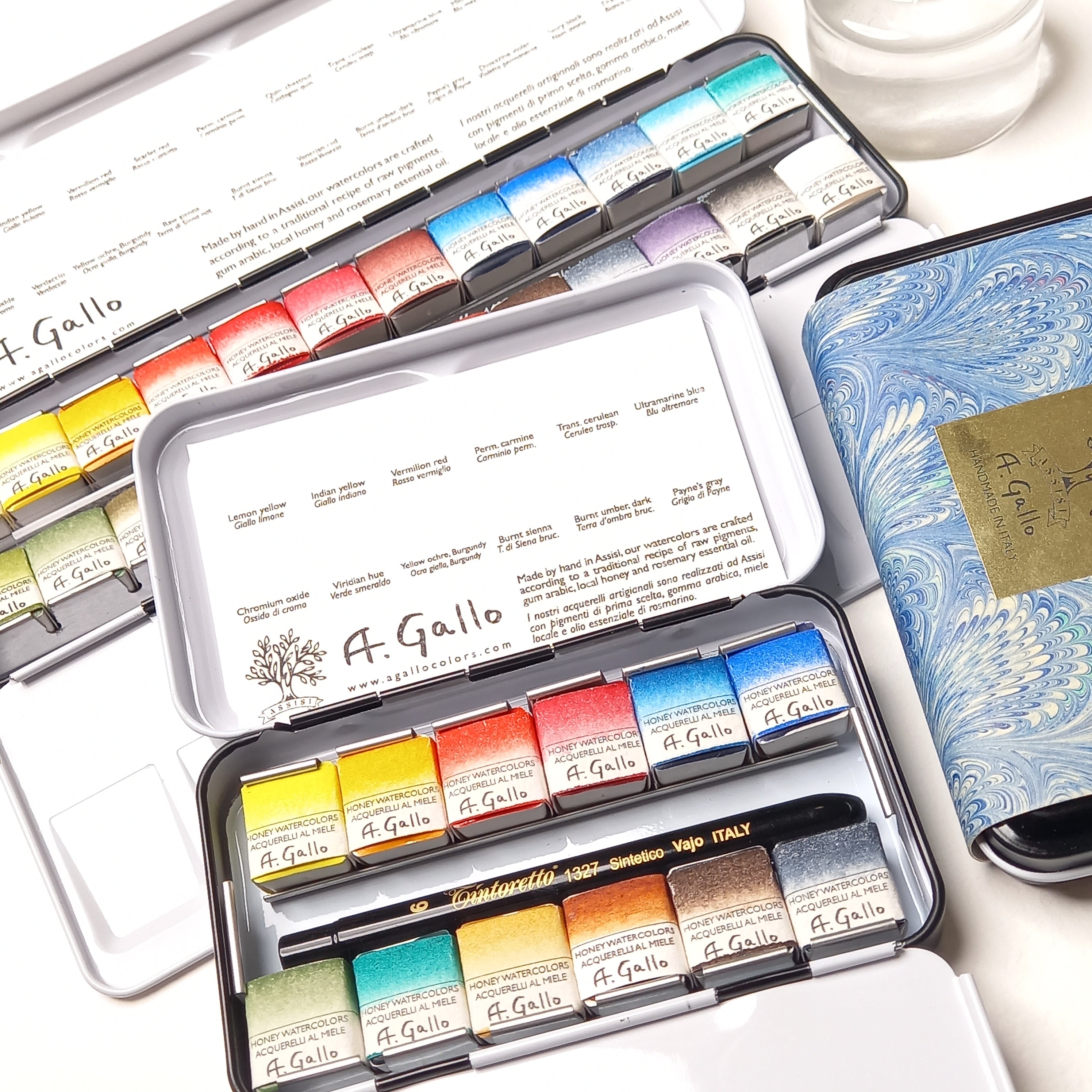 يتم تصنيع الألوان المائية من A. Gallo يدويًا في إيطاليا، من أفضل الأصباغ الطبيعية والتاريخية والمبتكرة الحديثة المتوفرة اليوم وفقًا لوصفة تقليدية من الأصباغ الخام والصمغ العربي والعسل المحلي من أومبريا وزيت إكليل الجبل العطري.