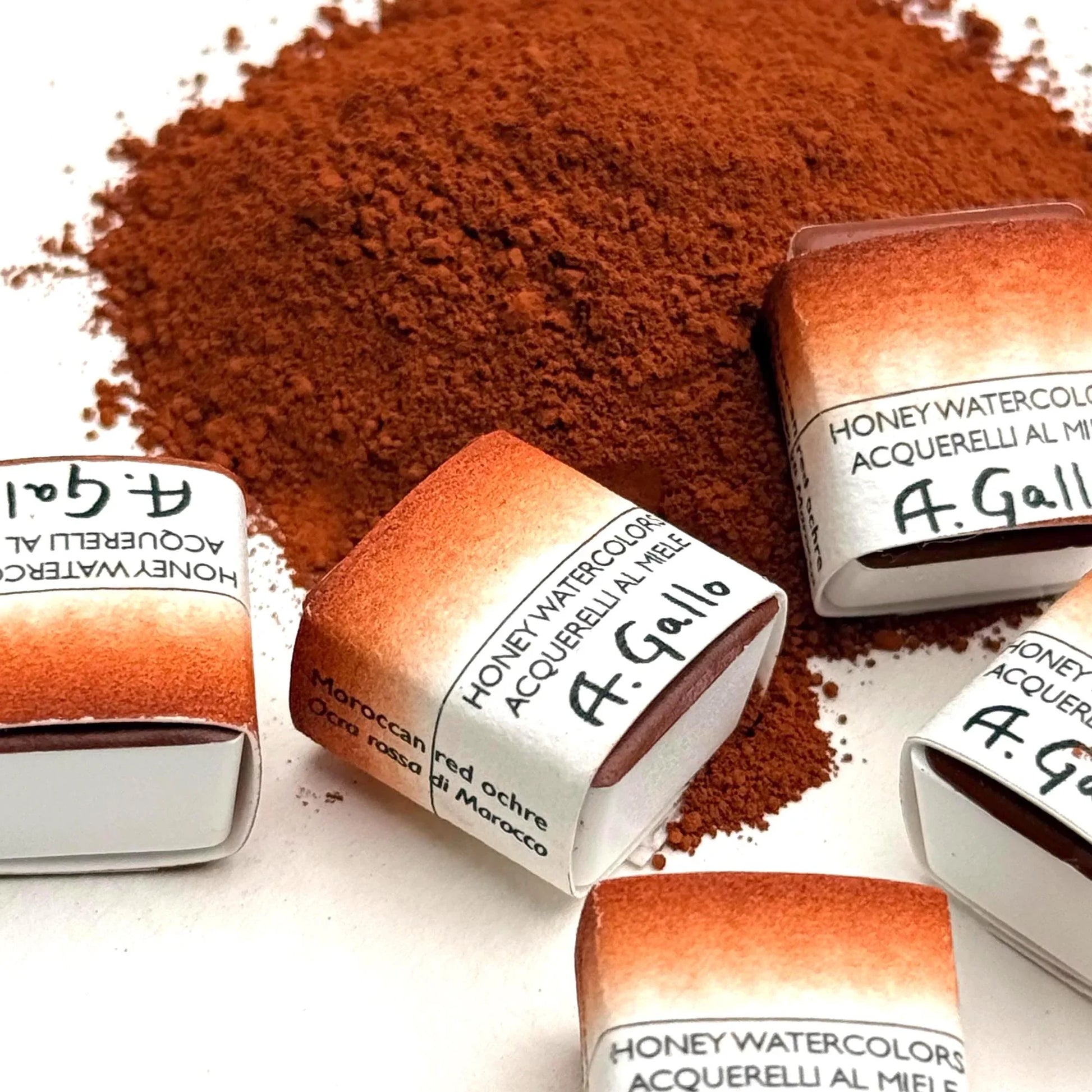 تُصنع ألوان إي غالّو المائية يدوياً في مدينة أسيزي، وفق وصفة تقليدية تعتمد على أصباغ خام وصمغ عربي وعسل محلي وزيت إكليل الجبل العطري وعامل ترطيب. تمنح هذه العملية الحرفية الطلاء لوناً غنياً ومضيئاً يتفاعل بجمال عند ملامسته للماء.