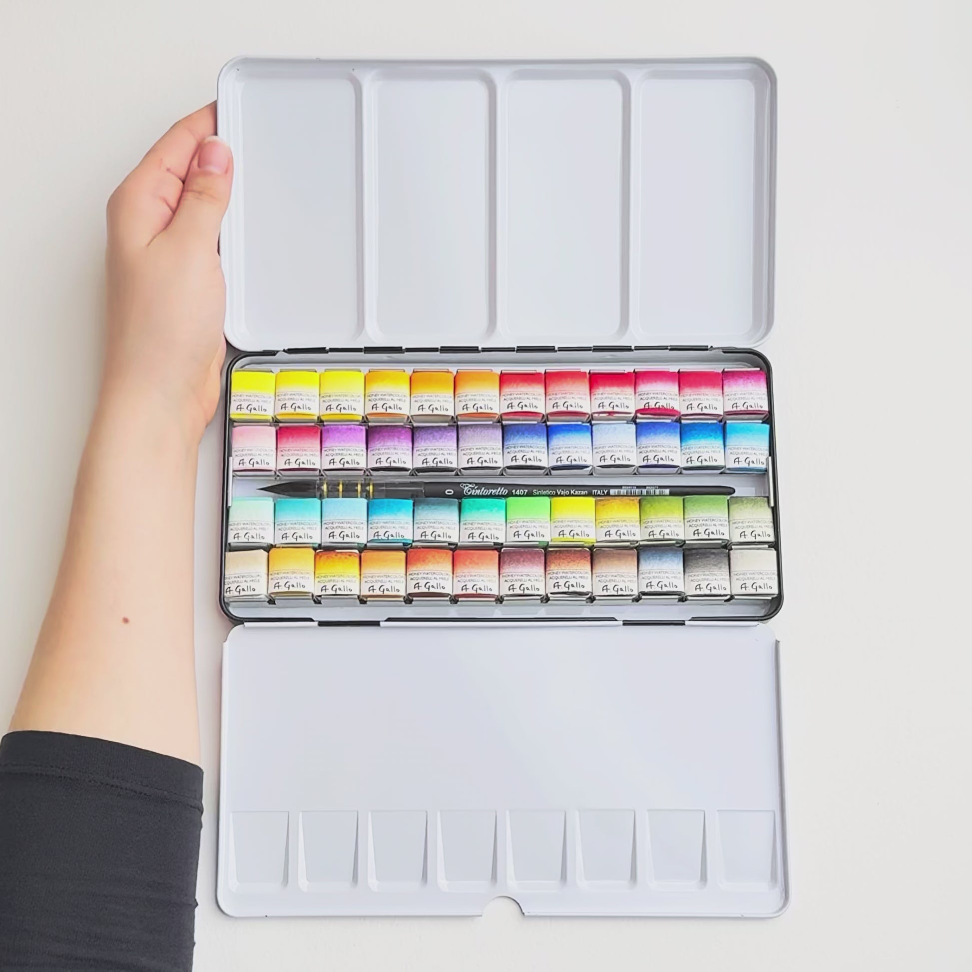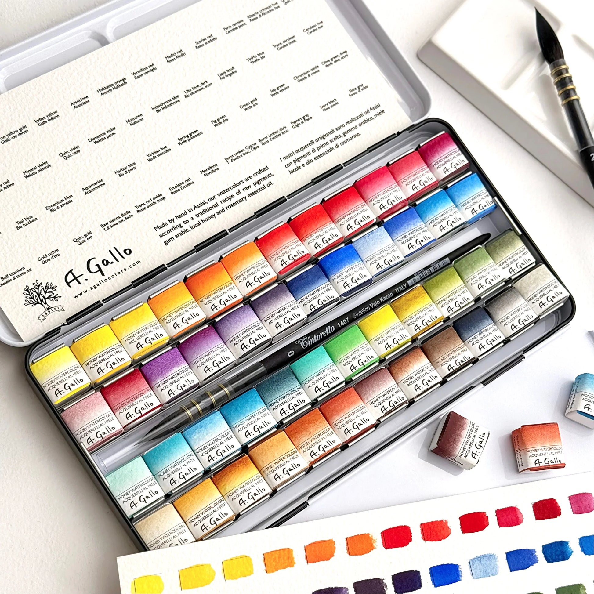 مجموعة ألوان مائية مصنوعة يدويًا مكونة من ثمانية وأربعين نصف مقلاة مع ملصقات مرسومة يدويًا في علبة ألوان مائية احترافية مع سطحين للخلط، ومخطط ألوان مطبوع على ورق ألوان مائية Arches، وفرشاة ممسحة Tintoretto Linea Feltracco مقاس 0.