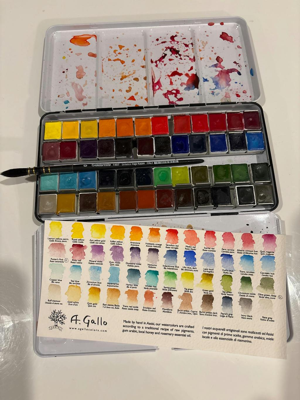 ألواننا المائية، المصنوعة يدويًا في أسيزي، مصنوعة وفقًا لوصفة تقليدية من أصباغ خام، وصمغ عربي، وعسل محلي، وزيت إكليل الجبل العطري، ومادة ترطيب. تُنتج هذه العملية الحرفية طلاءً غنيًا بالصبغات ومشرقًا، ينشط بشكل رائع عند البلل.