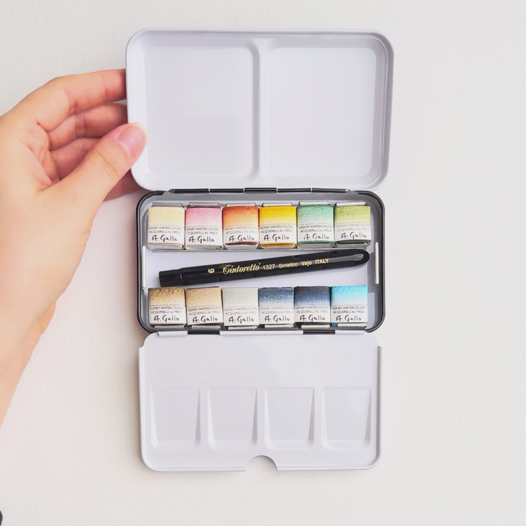 مجموعة ألوان مائية مصنوعة يدويًا من اثني عشر مقلاة نصفية مغلفة بشكل فردي في علبة معدنية مع سطحين للخلط، ومخطط ألوان مطبوع على ورق ألوان مائية Arches، وفرشاة جيب فنية من Tintoretto مقاس 6. مجموعة الألوان المائية المصنوعة يدويًا من Elements معبأة بورق رخامي أصلي من ورشة عمل حرفية في فلورنسا. وتأتي داخل صندوق هدايا أنيق.