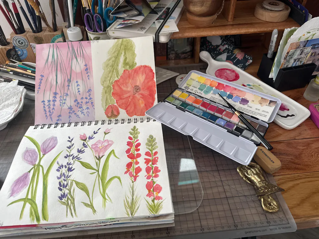This collection also pairs beautifully with A. Gallo’s transparent watercolors: begin with luminous underpaintings, then refine with opaque accents, highlights, text, and defined edges.