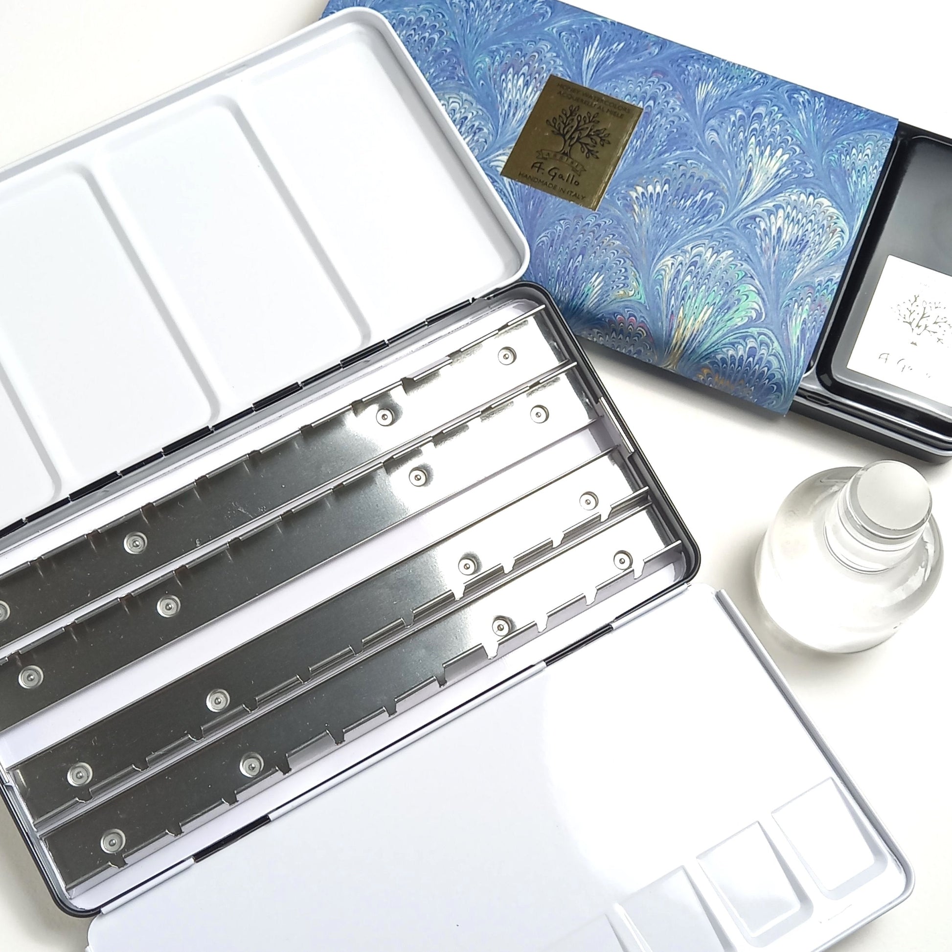 Our empty watercolor tins come in four sizes and are packaged with a handmade marbled paper band, a custom color chart on Arches watercolor paper and an elegant made in Italy gift box.