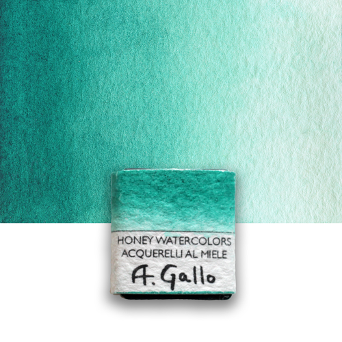 Now available in full pan size! Viridian hue is a brilliant, transparent green with bluish shade. A cool phthalo green tone with a touch of ultramarine, this color granulates slightly and is good for mixing with yellows and reds.