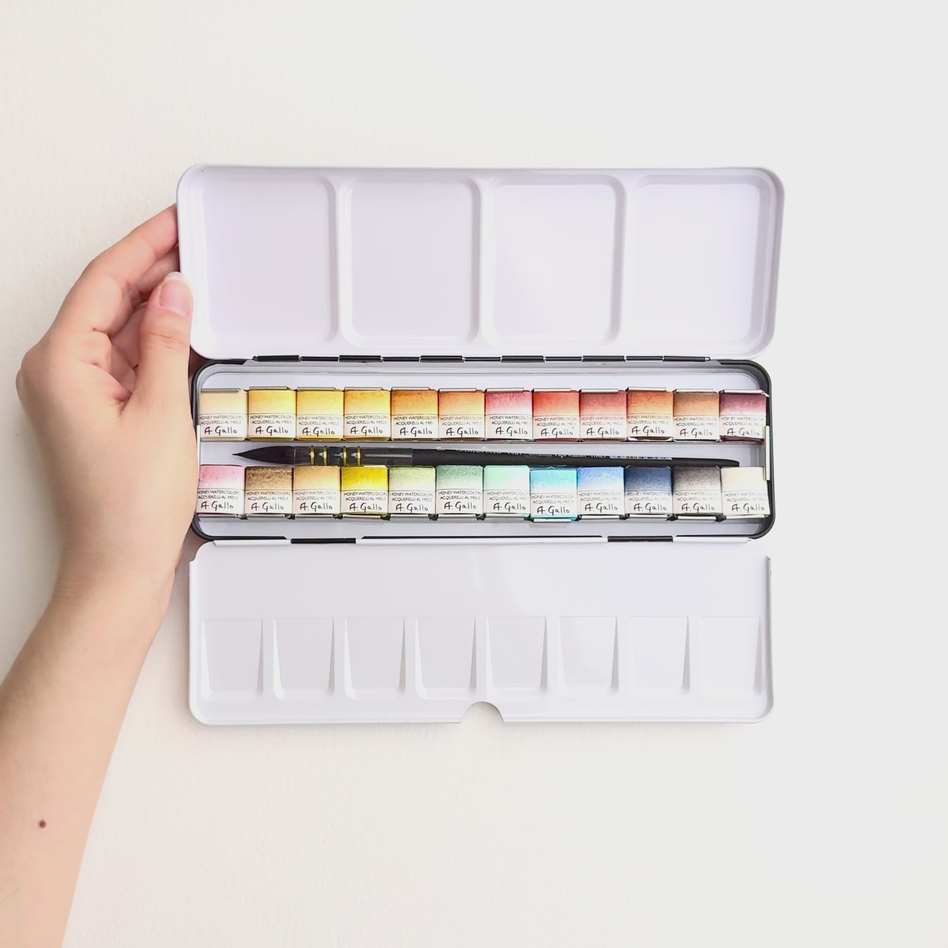 Handmade watercolor set of twenty-four individually wrapped half pans in a metal tin with two mixing surfaces, a DIY color chart printed on Arches watercolor paper, and a cruelty free Tintoretto traditional mop brush size 0. The Naturale 24 handmade watercolor set is packaged with original marbled paper by a Florentine artisan workshop and comes inside an elegant gift box.