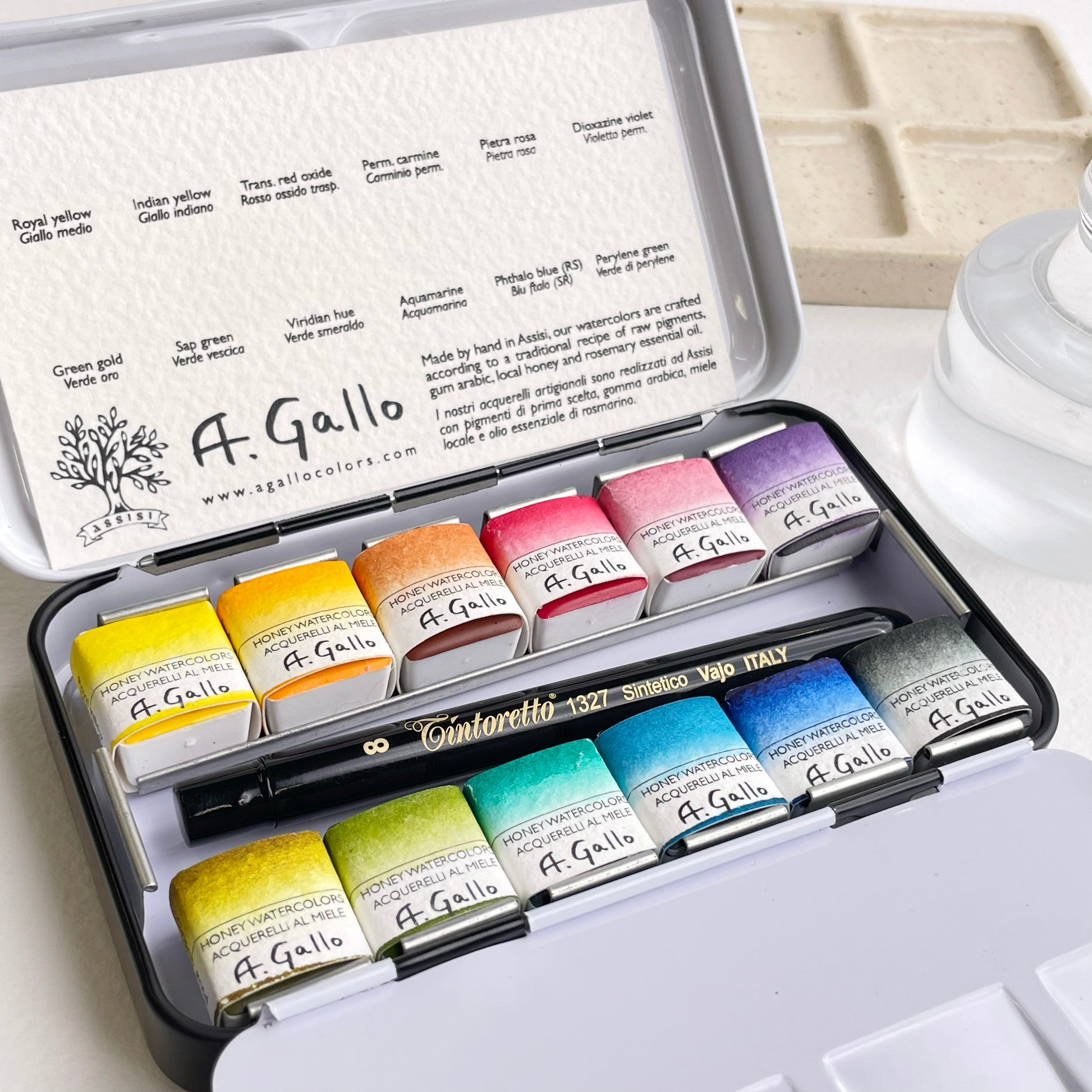 Made by hand in Assisi, our watercolors are crafted according to a traditional recipe of raw pigments, gum arabic, local honey, rosemary essential oil and a wetting agent. This artisanal process creates a very pigmented and luminous paint that activates beautifully when wet.
