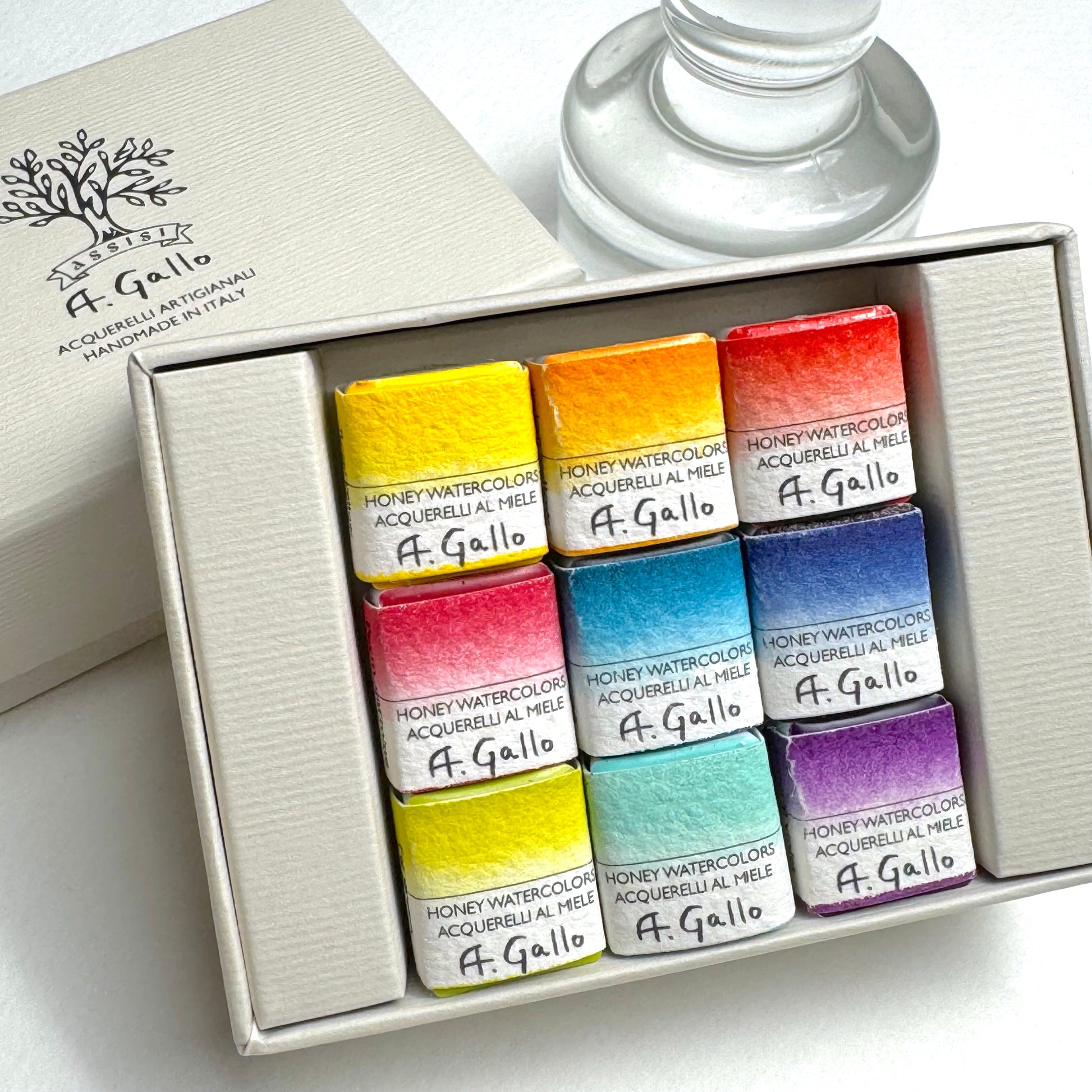 Made by hand in Assisi, our watercolors are crafted according to a traditional recipe of raw pigments, gum arabic, local honey, rosemary essential oil and a wetting agent. This artisanal process creates a very pigmented and luminous paint that activates beautifully when wet.