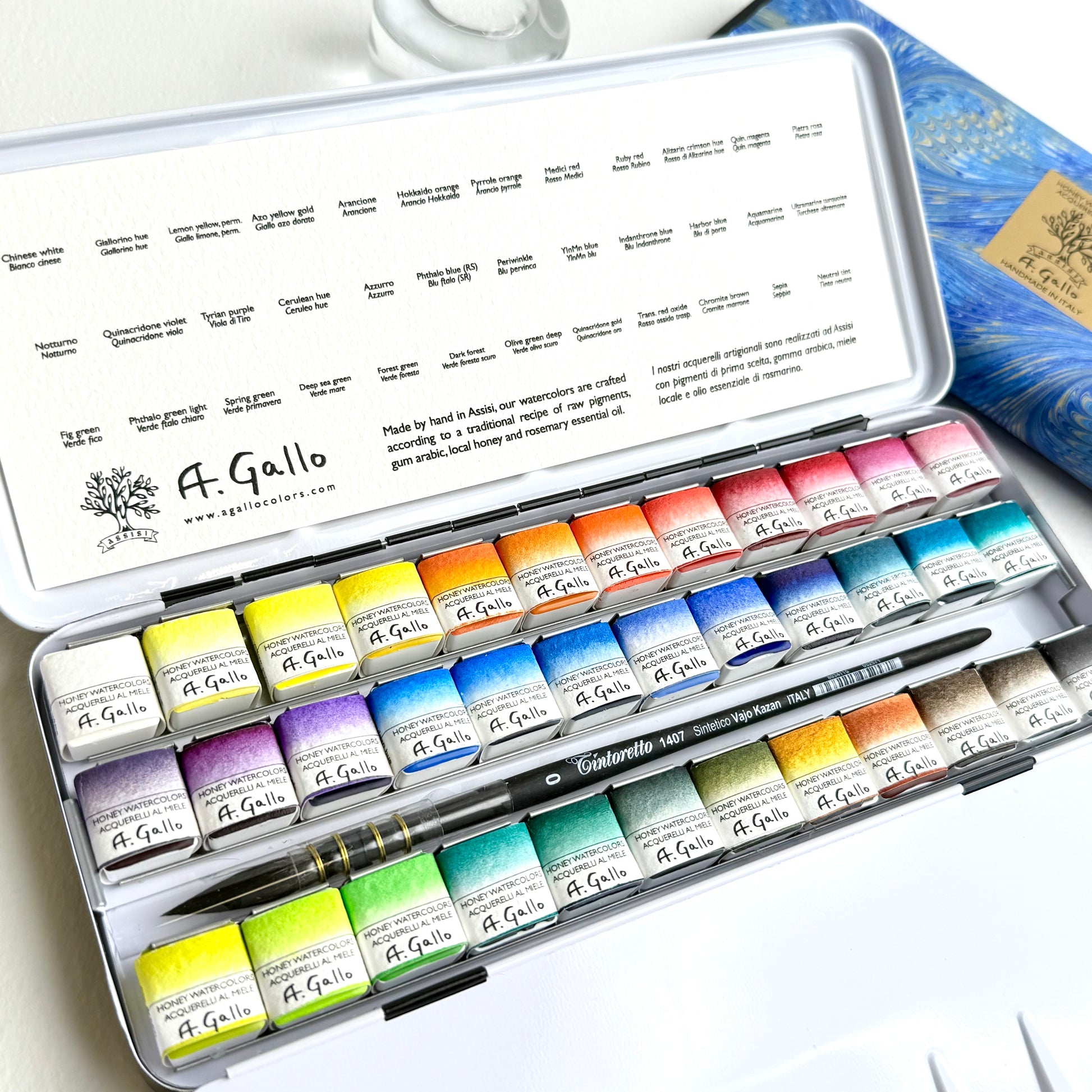 Made by hand in Assisi, our watercolors are crafted according to a traditional recipe of raw pigments, gum arabic, local honey, rosemary essential oil and a wetting agent. This artisanal process creates a very pigmented and luminous paint that activates beautifully when wet.
