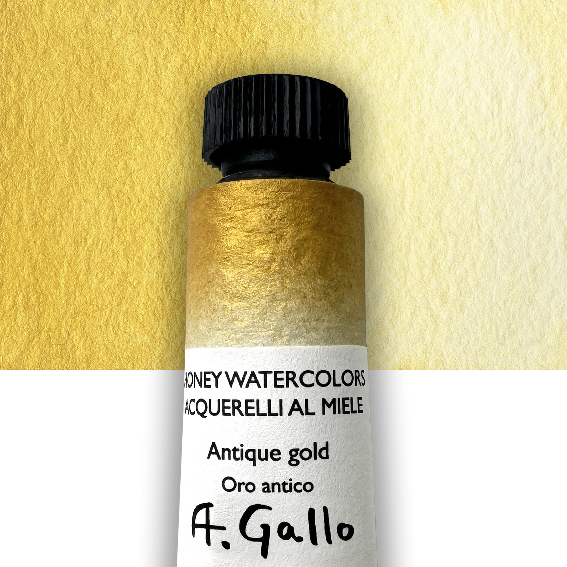 New tube format! Antique gold is made from a special blend of natural Raw siena from Mount Amiata and a warm metallic gold. It is inspired by the shade of gold found in medieval manuscript painting.