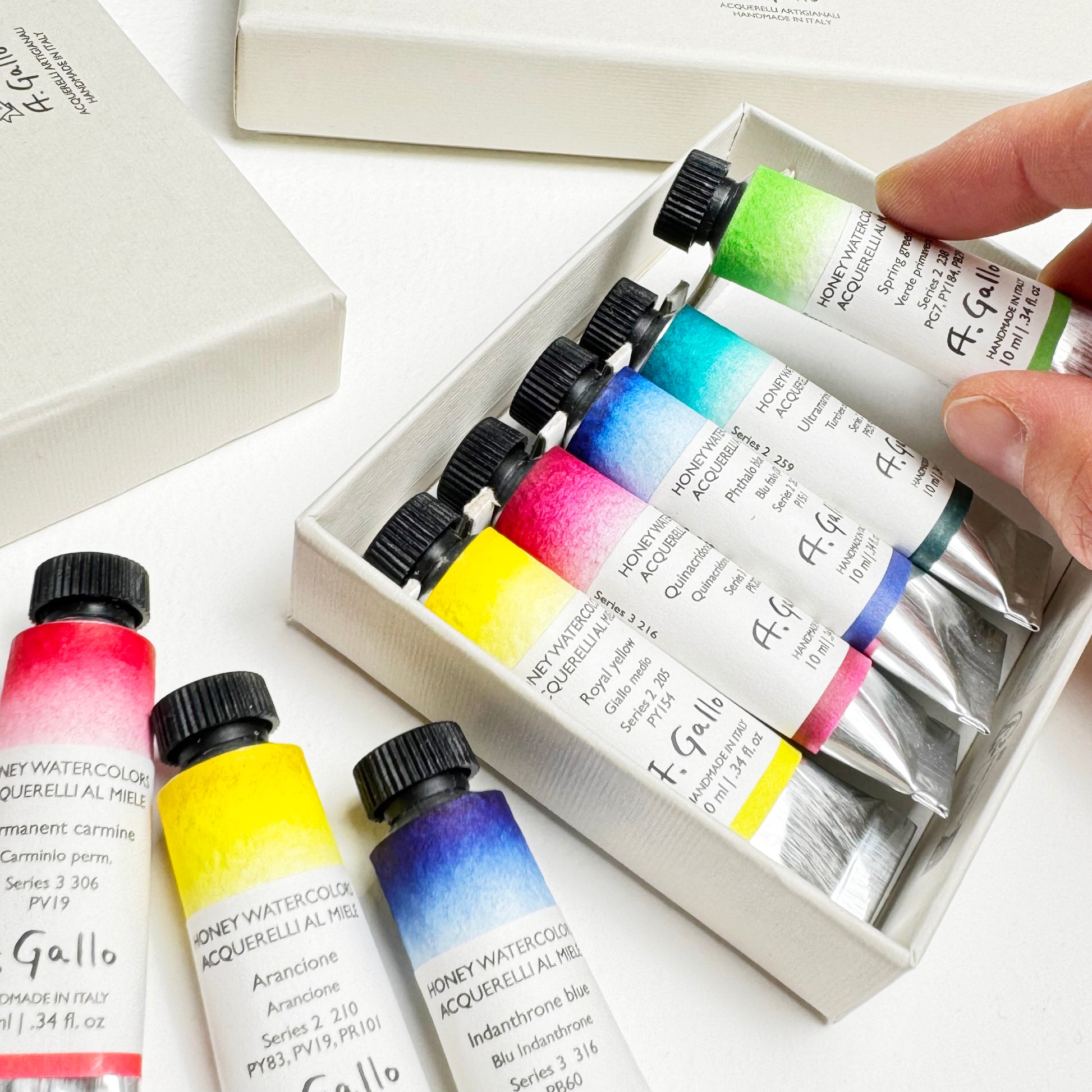 Made by hand in Assisi, our watercolors are crafted according to a traditional recipe of raw pigments, gum arabic, local honey, rosemary essential oil and a wetting agent. This artisanal process creates a very pigmented and luminous paint that activates beautifully when wet.