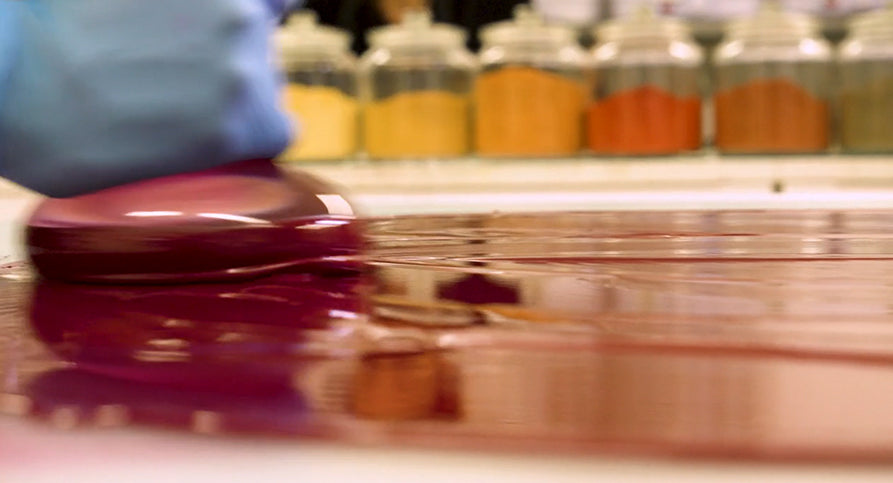Once mulled, the paint is transferred from the glass slab into a jar to rest, ensuring that the pigment is stabilized with the binder. Then, unlike commercially "extruded" paints, it is poured by hand into the pans which are refilled several times as they dry over the course of 4-5 weeks.